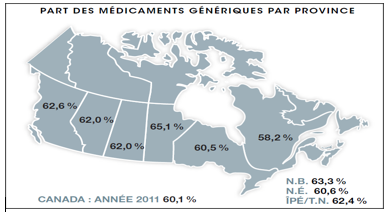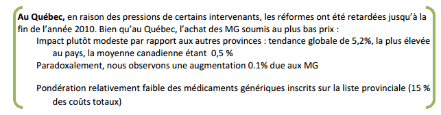Dans le contexte d’augmentation alarmante des coûts attribués aux médicaments et de l’arrivée à l’échéance de certains brevets, les gouvernements provinciaux ont adopté ces dernières années des mesures de réduction graduelle du prix des médicaments génériques. Ces mesures visent, entre autres, la réduction et le contrôle des coûts. Au Québec, à compter d’avril 2012 le prix maximal d’un médicament générique est fixé à 25% du prix du médicament de marque.