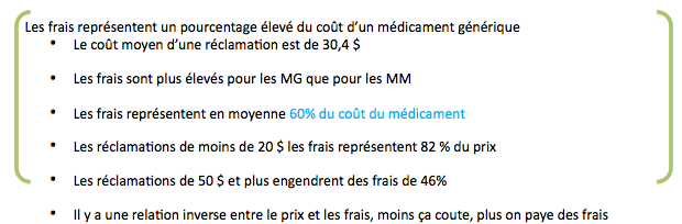 par Giraco Groupe Solutions, les frais moyens estimés perçus par les pharmacies (marge du grossiste+ frais d’exécution+ marge de profit+ autres frais) s’élèvent à 18 $ pour les MG et à 14 $ pour les MM.